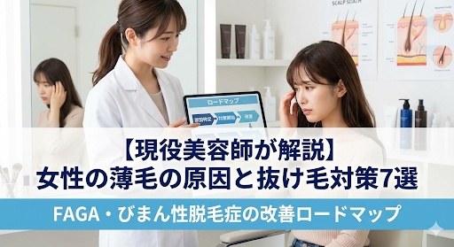 女性の薄毛は、男性のように一部分だけが薄くなるのではなく、頭部全体が均等に薄くなる**「びまん性脱毛症」**がほとんどです。原因はストレスや加齢、ホルモンバランスの乱れなど様々ですが、正しい対策をすることで改善が可能です。